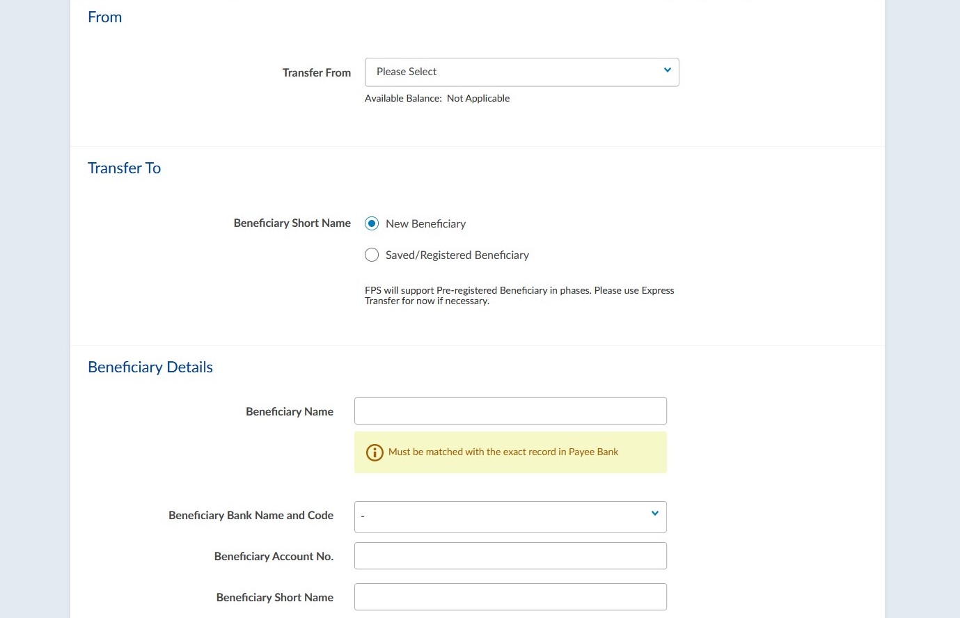 - Faster Payment Service only supports same currency transfer. The currencies of debit account and payment must be the same and either in HKD or CNY. At the moment, Faster Payment Service only supports transfer through Beneficiary Name and Beneficiary Account Number, transfer through Beneficiary’s mobile phone number / email / FPS Identifier (FPS ID) are not yet supported.