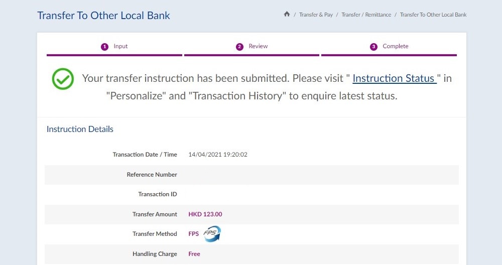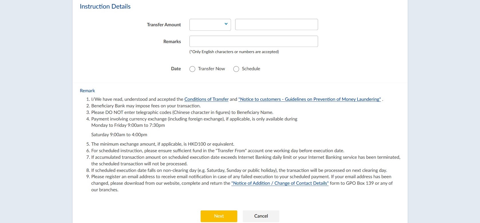 - In general, the transaction instruction is processed by the Bank in prompt. Receiving time of the fund will be subjected to the process of the receiving bank. For scheduled transfer, please check the instruction status and transaction history on the selected transaction execution day.