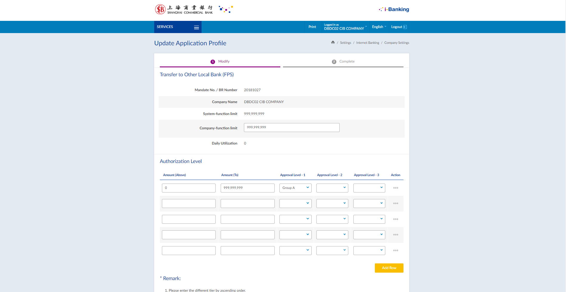 - select "Settings > Company Settings", then select "Transfer to Other Local Bank (FPS)" and click "Update" to setup daily authorization limit and authorization matrix under "Company function limit" and "Authorization Level" respectively.
