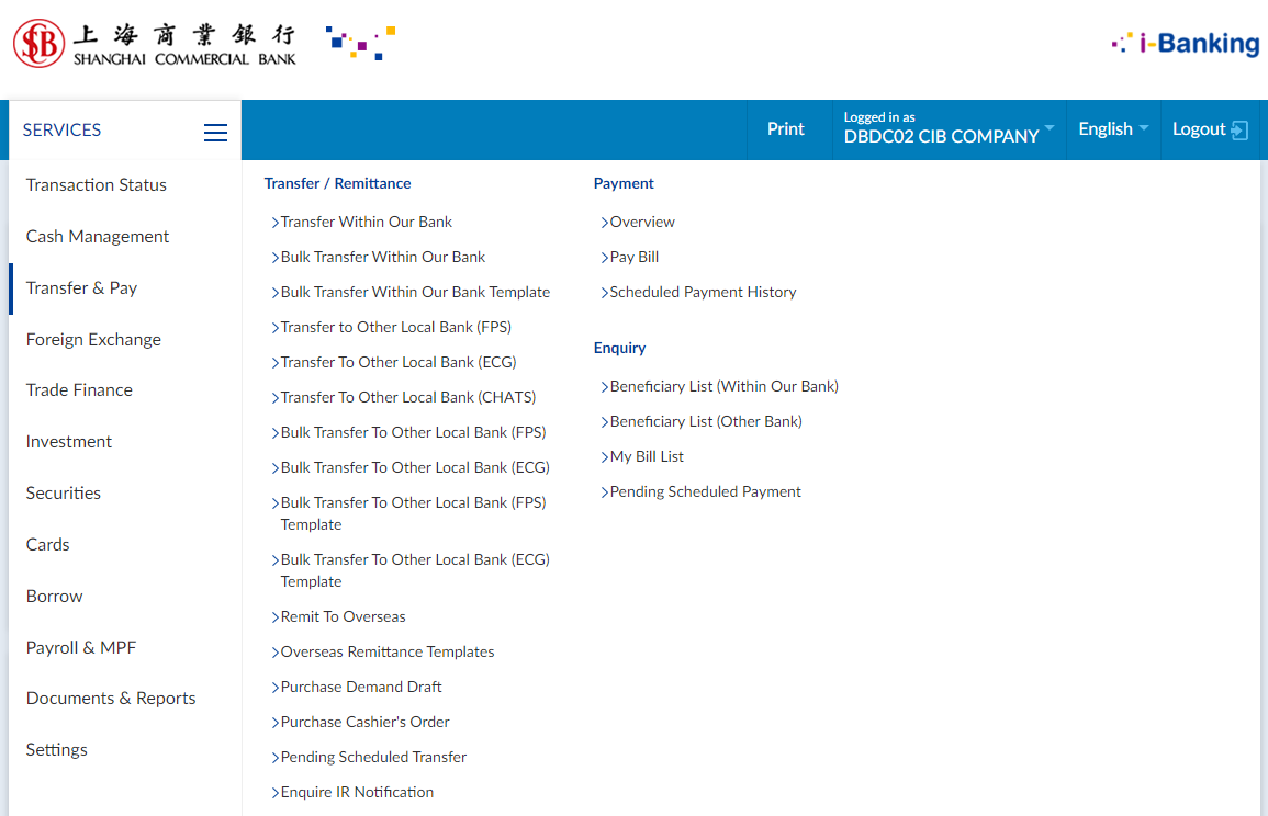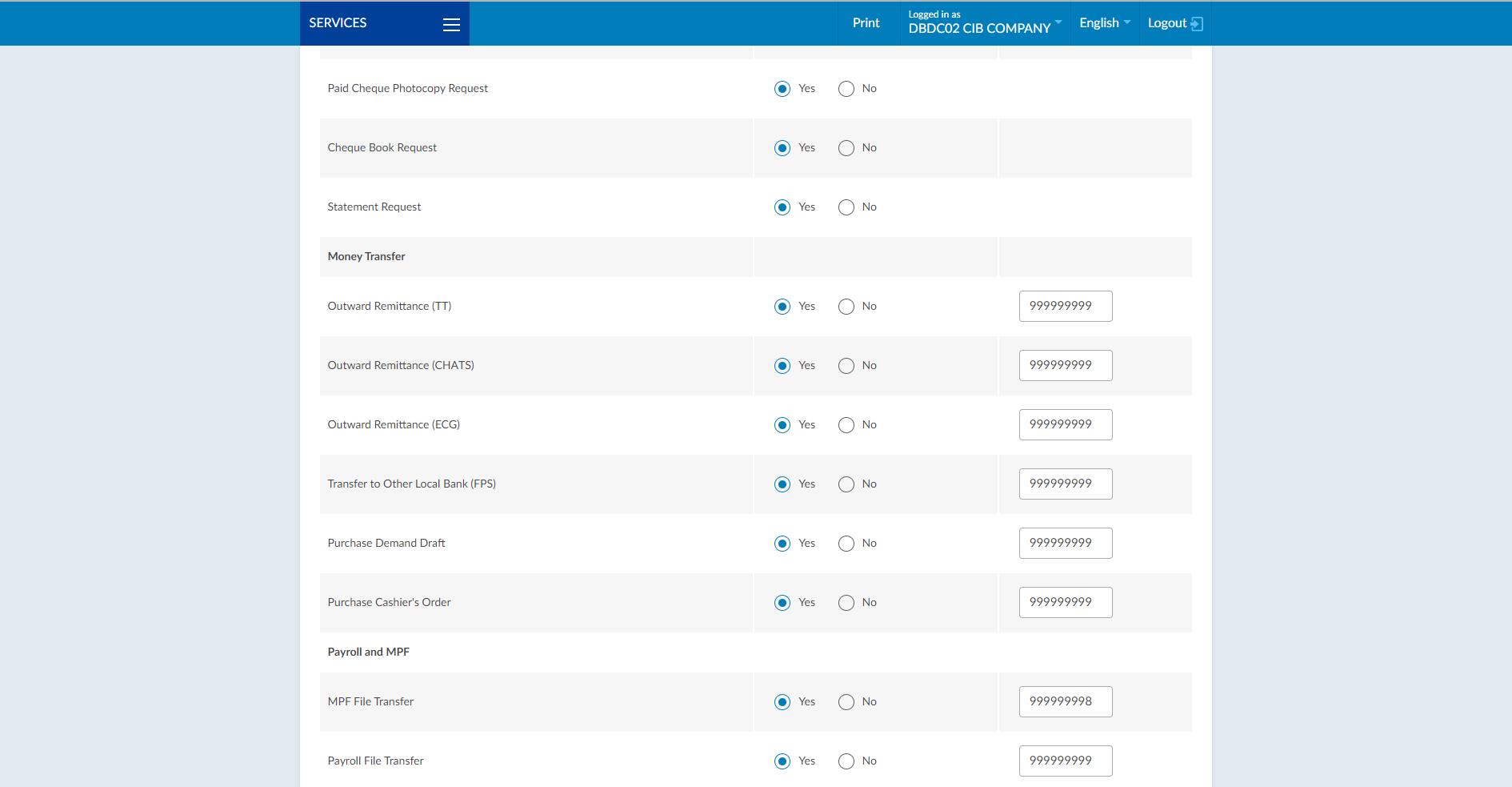 - set up Company's daily authorization limit and authorization matrix for "Transfer to Other Local Bank (FPS)" function as well as the access rights for the user(s) and daily personal authorization limit for Authorizer(s).