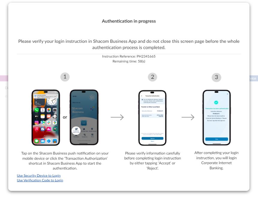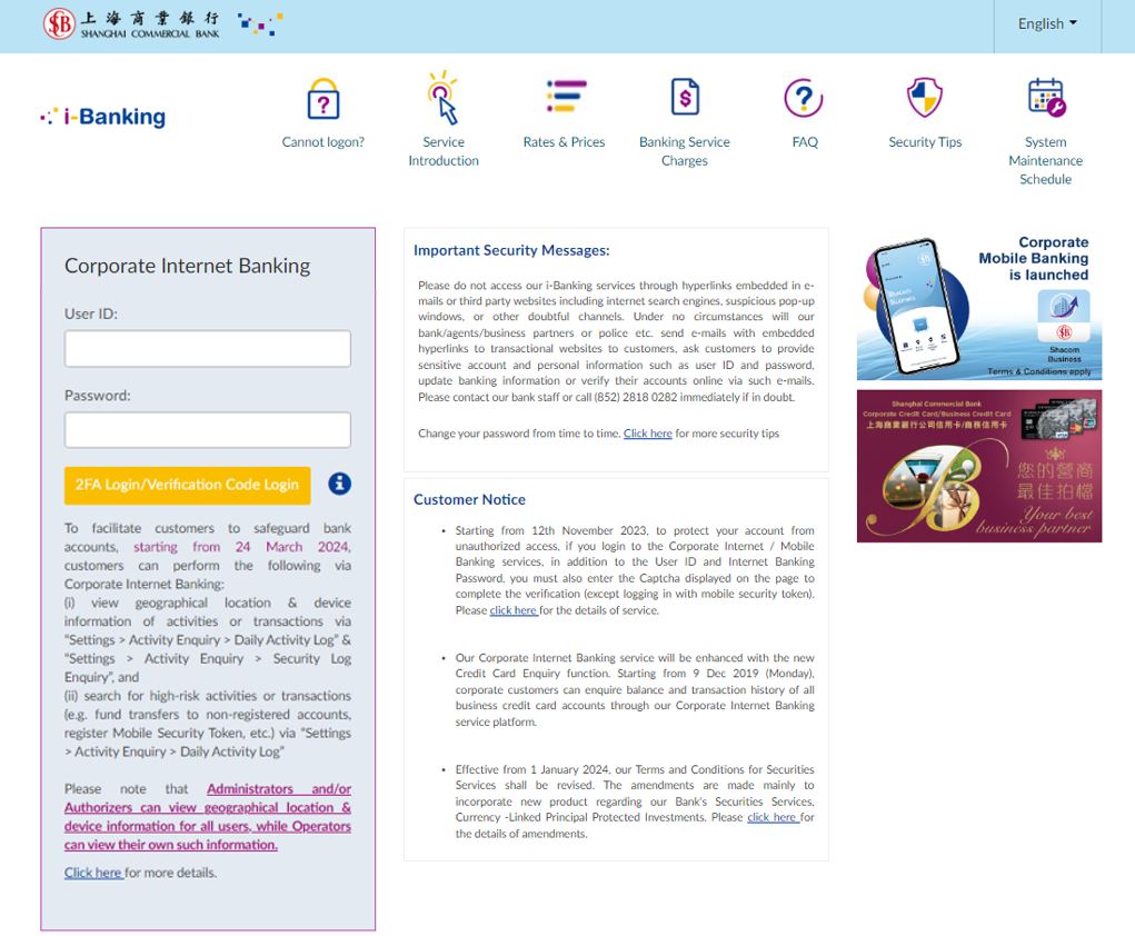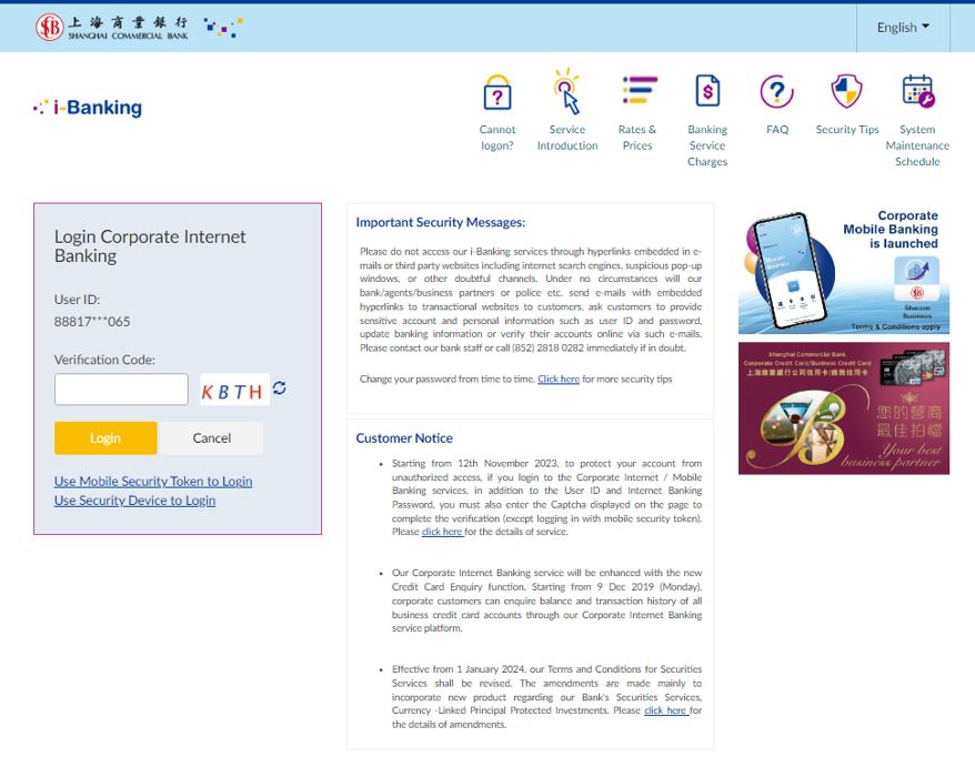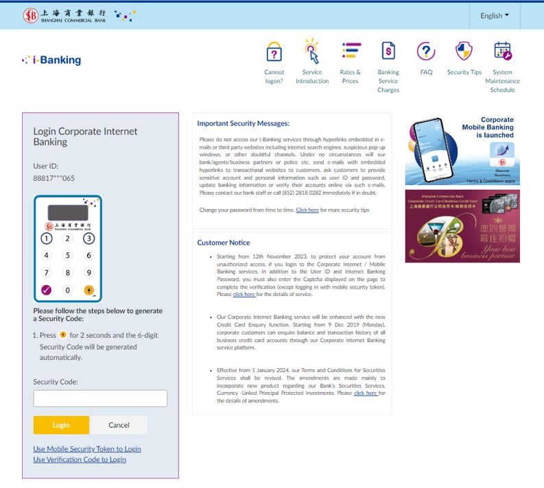 When logging in to Corporate Internet Banking, in addition to the User ID and Internet Banking Password, you must also use Mobile Security Token or use Physical Security Device or enter the Captcha displayed on the page for verification. If you have not registered for the Mobile Security Token, download our Shacom Business App and register now. Please Click Here for more details!
