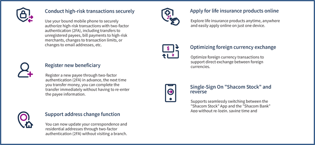 Shacom Bank App provides you a comprehensive and seamless mobile banking experience! Should you have any enquiries, please contact our Customer Service Hotline at 2818 0282.