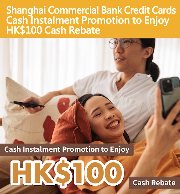 During the Promotion Period, successfully apply for Cash Instalment amount of HK$50,000 or above with Shanghai Commercial Bank Credit Card can enjoy HK$100 Cash Rebate!