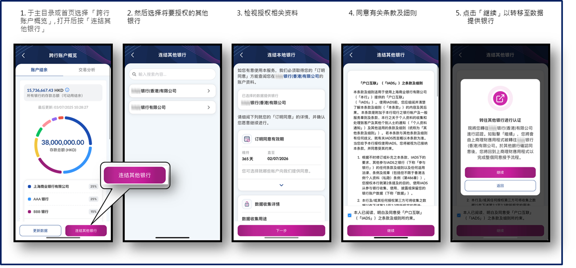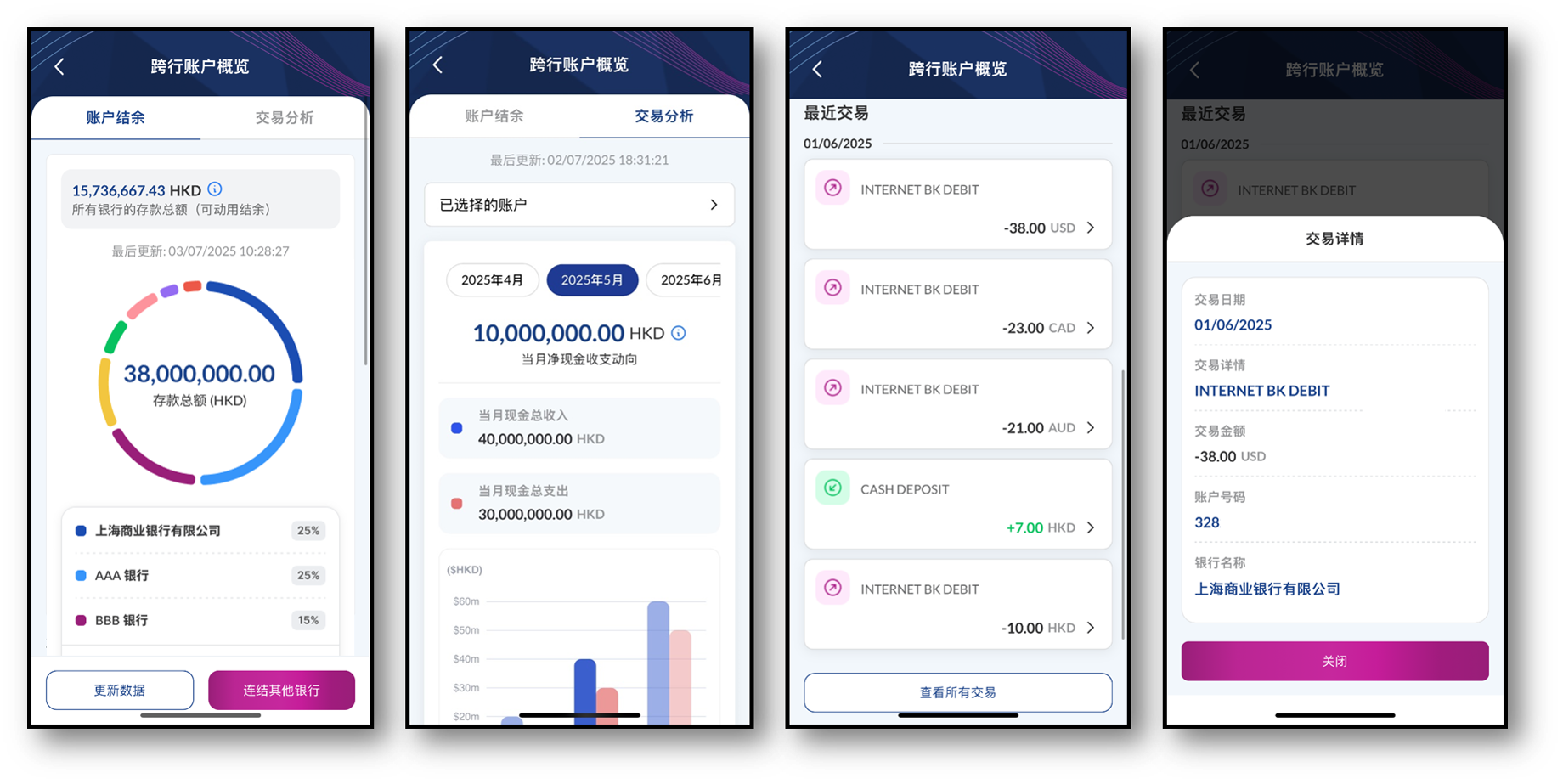 - 跨行账户结余总览:透过「户口互联」一经连系,客户即可阅览本行以及其他银行的账户结余,轻松全面掌握个人财务状况。