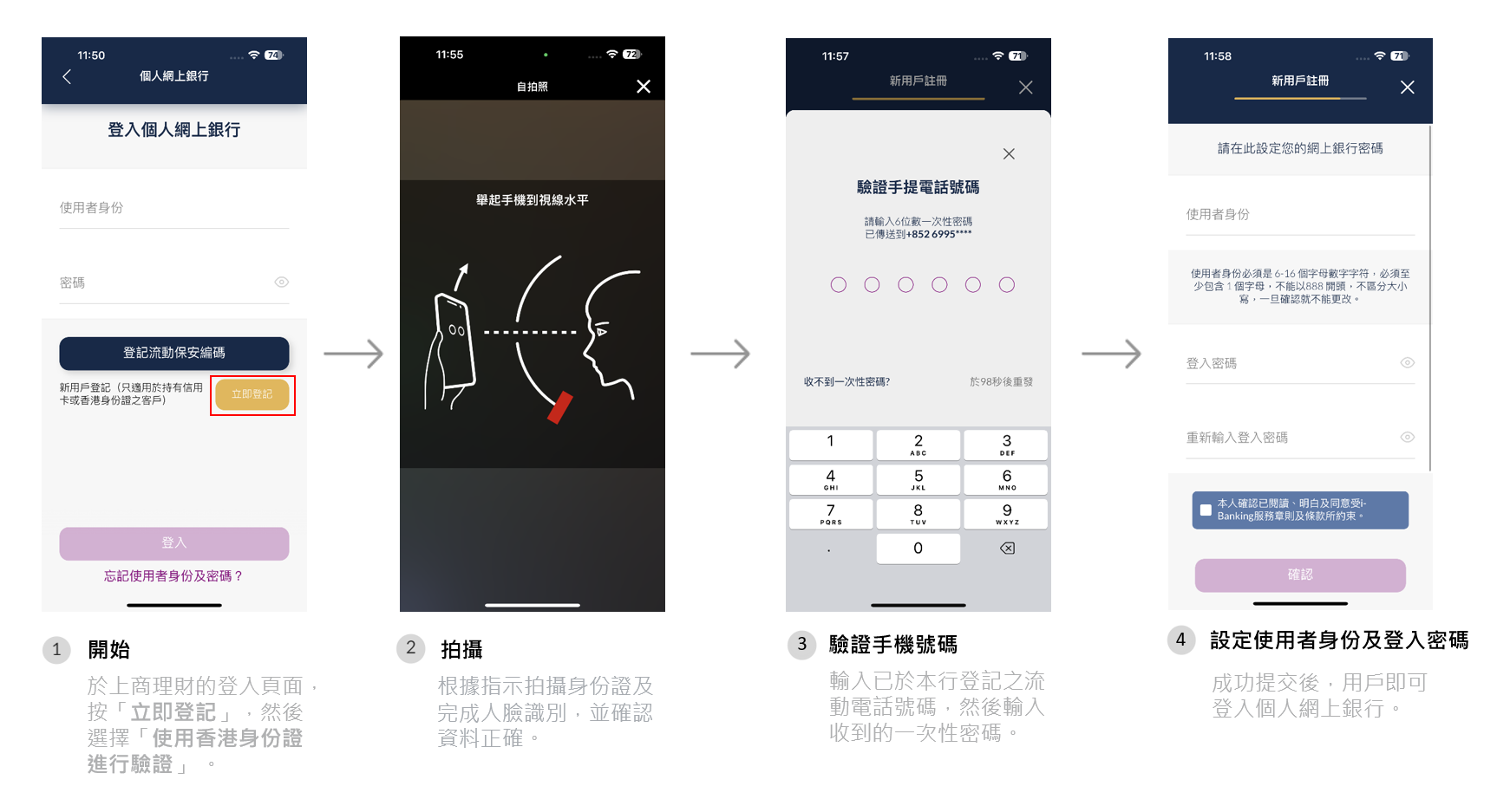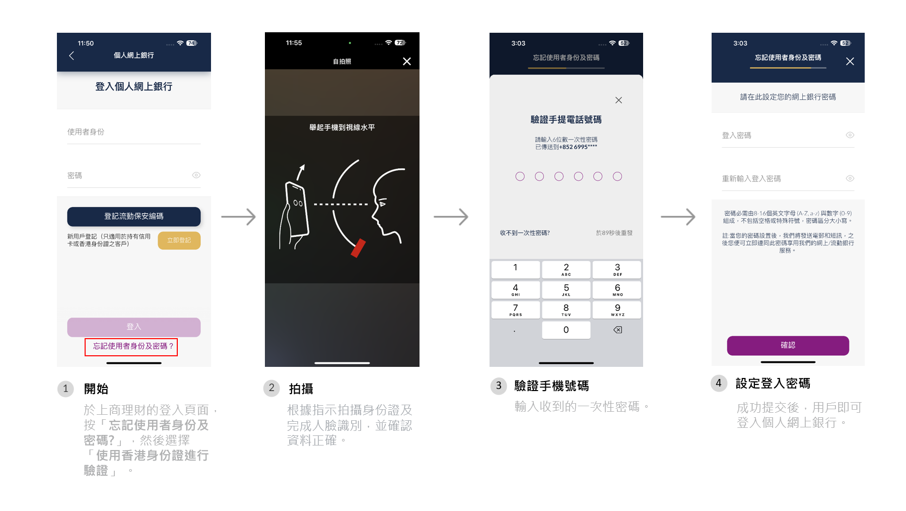 為提升客戶的網上銀行體驗,本行已推出新功能,讓客戶可以透過流動裝置,安全及方便地登記網上銀行或重設密碼,過程只需數分鐘!
