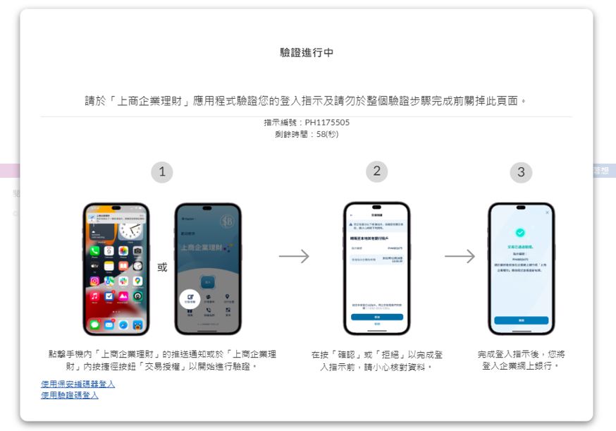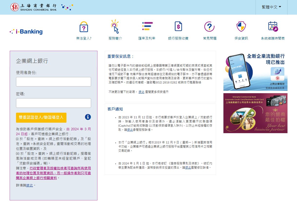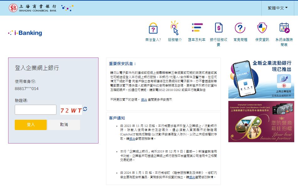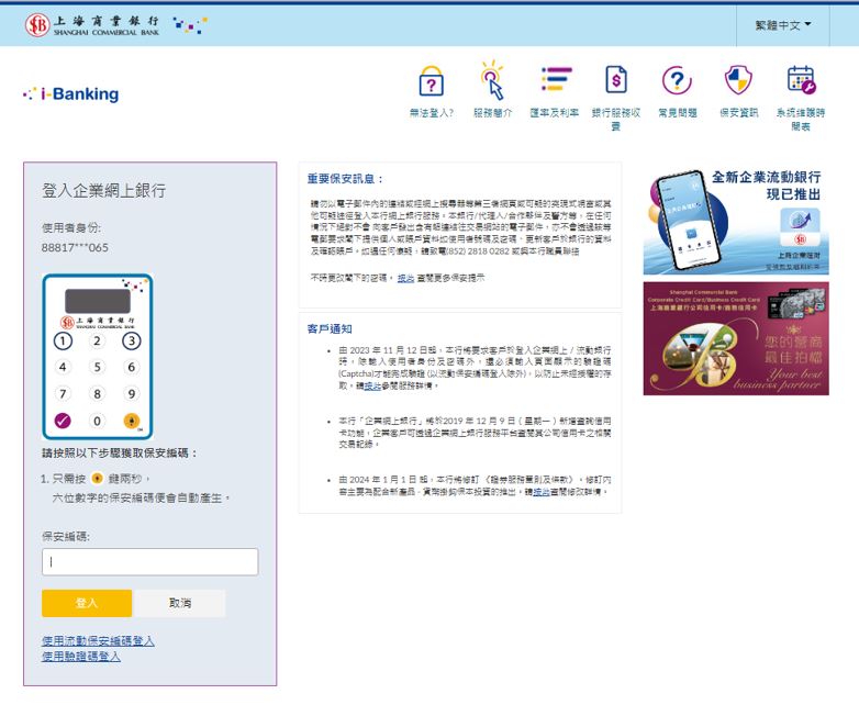 當您登入企業網上銀行時,除輸入使用者身份及密碼外,還須透過「流動保安編碼」或實體「保安編碼器」或輸入頁面顯示的驗證碼(Captcha)以作驗證。如您仍未登記「流動保安編碼」,請立即下載「上商企業理財」手機應用程式並進行登記,詳情請按此 。