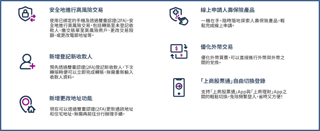 「上商理財」為您提供更全面、無縫的手機銀行體驗!如有任何查詢,請致電本行客戶服務熱線2818 0282。