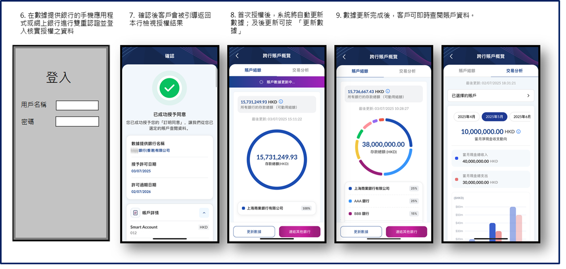 *的實時存款資料,如賬戶號碼、賬戶結餘、交易歷史等記錄,以及賬戶資產配置分析 、每月賬戶資金流分析 ,進一步提升客戶體驗。