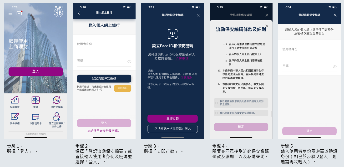 由 2025 年 9 月 26 日起,為加強保安措施以保障客戶,如您已年滿18歲並透過香港身份證開戶,於「上商理財」手機應用程式登記「流動保安編碼」時,須使用您的香港身份證及自拍照驗證身份,成功啟動「流動保安編碼」後即可登入使用個人流動銀行服務(包括高風險交易)。如您透過其他身份證明文件開戶,您仍可使用「短訊一次性驗證碼」驗證身份及登記「流動保安編碼」 ,惟成功登記後,高風險交易服務會被暫時停用,您須先致電本行客戶服務熱線或親臨分行驗證身份,以進行個人網上/流動銀行之高風險交易。請更新「上商理財」手機應用程式至最新版本,體驗優化的服務。