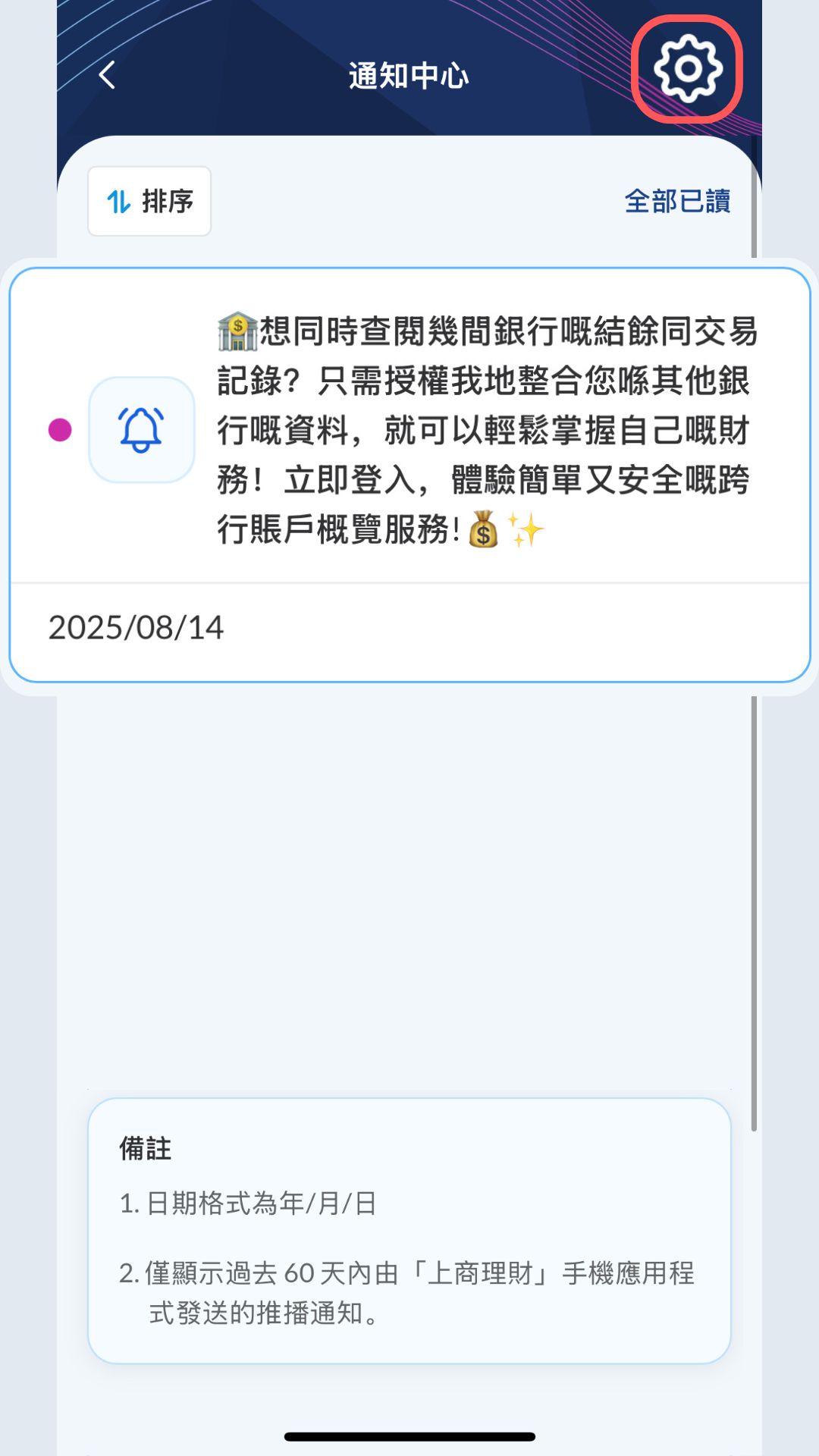 步驟3:你可在此查閱過往的推播通知; 或按「⚙」進入推播通知設定