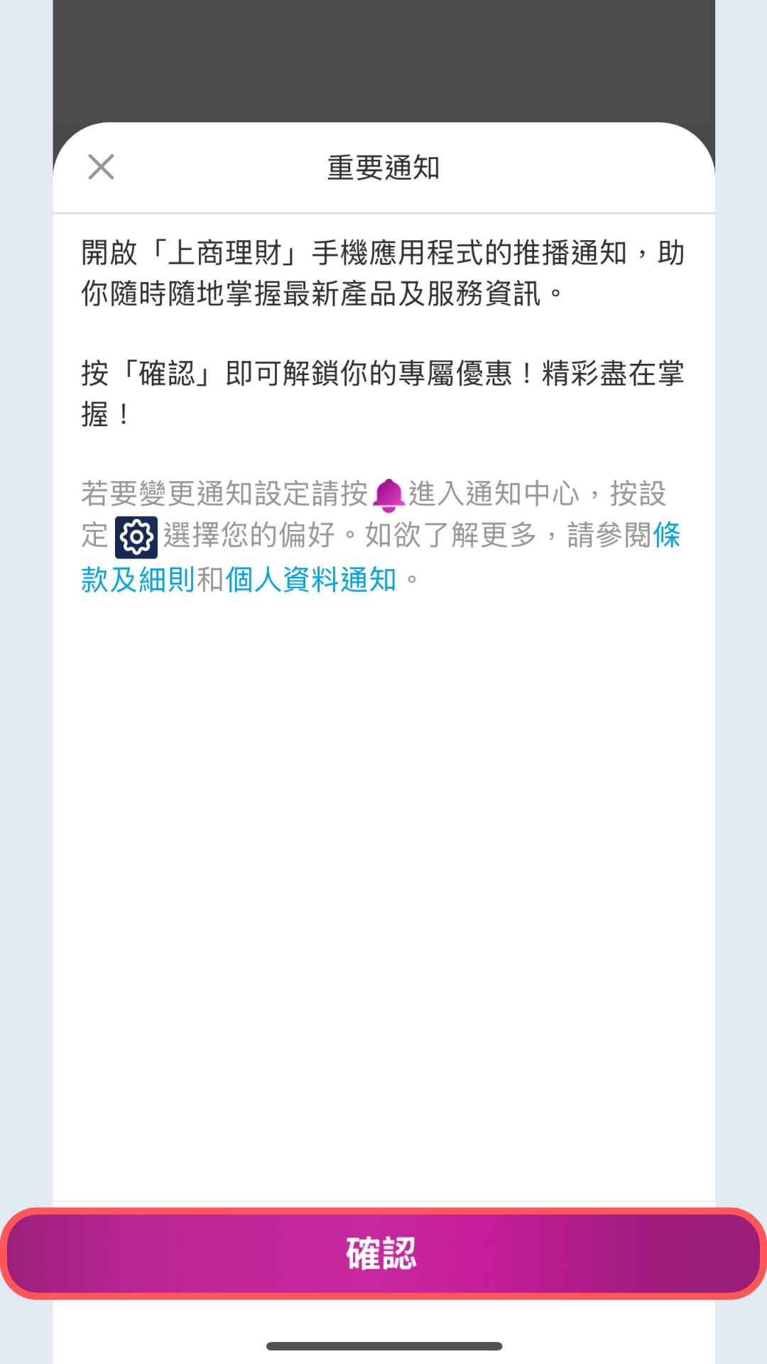 步驟2: 重要通知視窗將自動彈出,按「確認」即可啟用推播通知