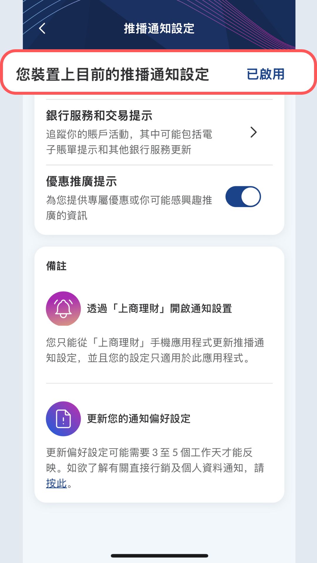- 啟用推播通知,你便可收到本行的銀行提示、優惠及產品最新資訊,最新資訊盡在掌握。