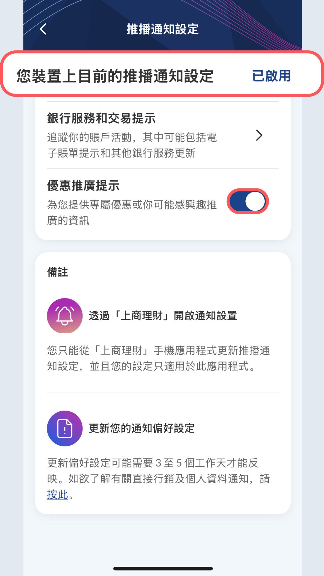 步驟4:於推播通知設定頁面查閱/更改推播通知啟用狀況