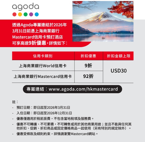 優惠受條款及細則約束,詳情請瀏覽Mastercard網站:specials.priceless.com/zh-hk/offers/Agoda?Oid=202503210003&issuerId=&productId=