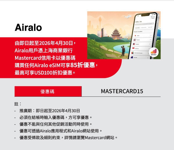 優惠受條款及細則約束,詳情請瀏覽Mastercard網站:specials.priceless.com/zh-hk/offers/Airalo的全球福利?Oid=202304260001&issuerId=&productId=