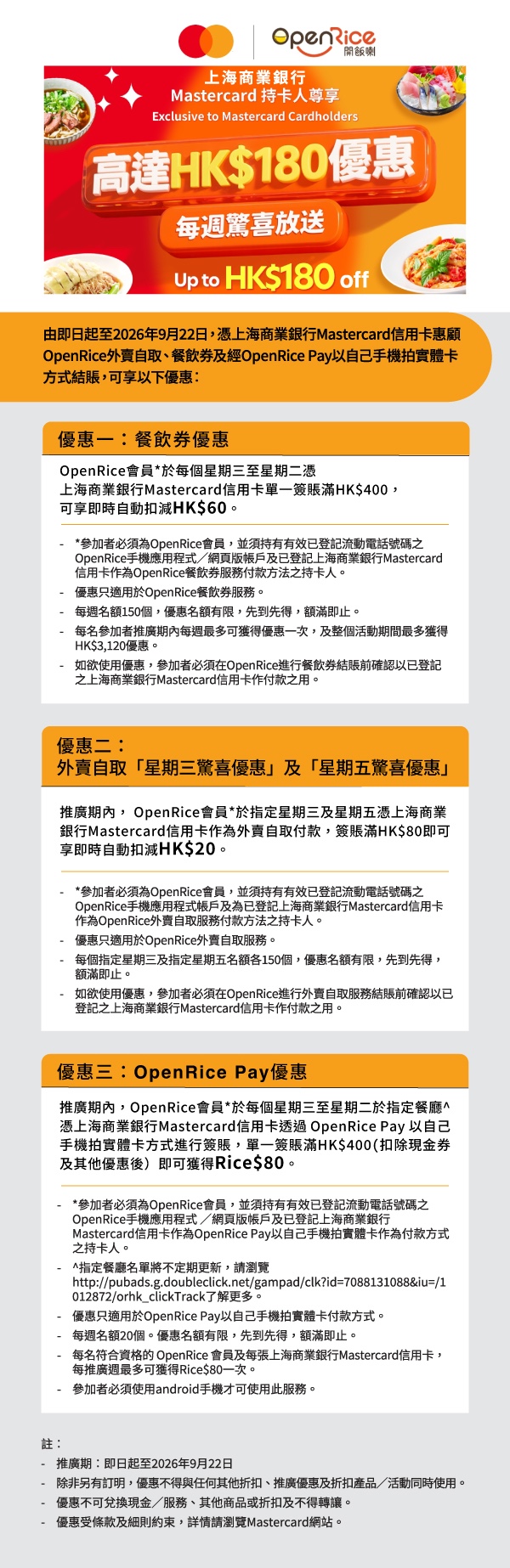 優惠受條款及細則約束,詳情請瀏覽Mastercard網站:specials.priceless.com/zh-hk/offers/OpenRice_開飯喇?Oid=201909130003&issuerId=&productId=