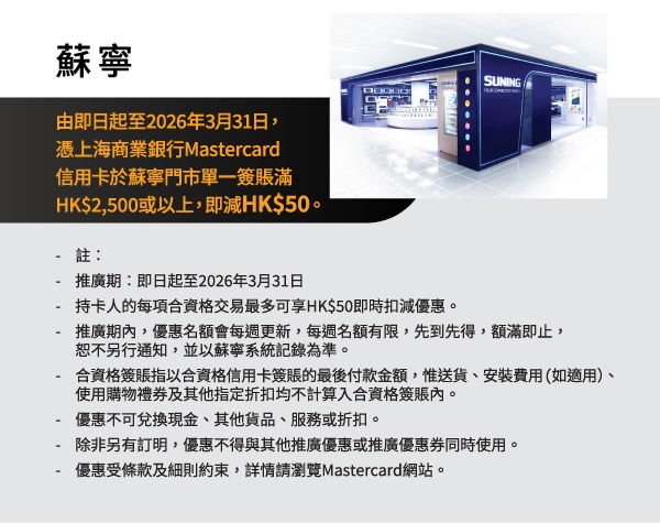 優惠受條款及細則約束,詳情請瀏覽Mastercard網站:specials.priceless.com/zh-hk/offers/蘇寧?Oid=202503310003&issuerId=&productId=